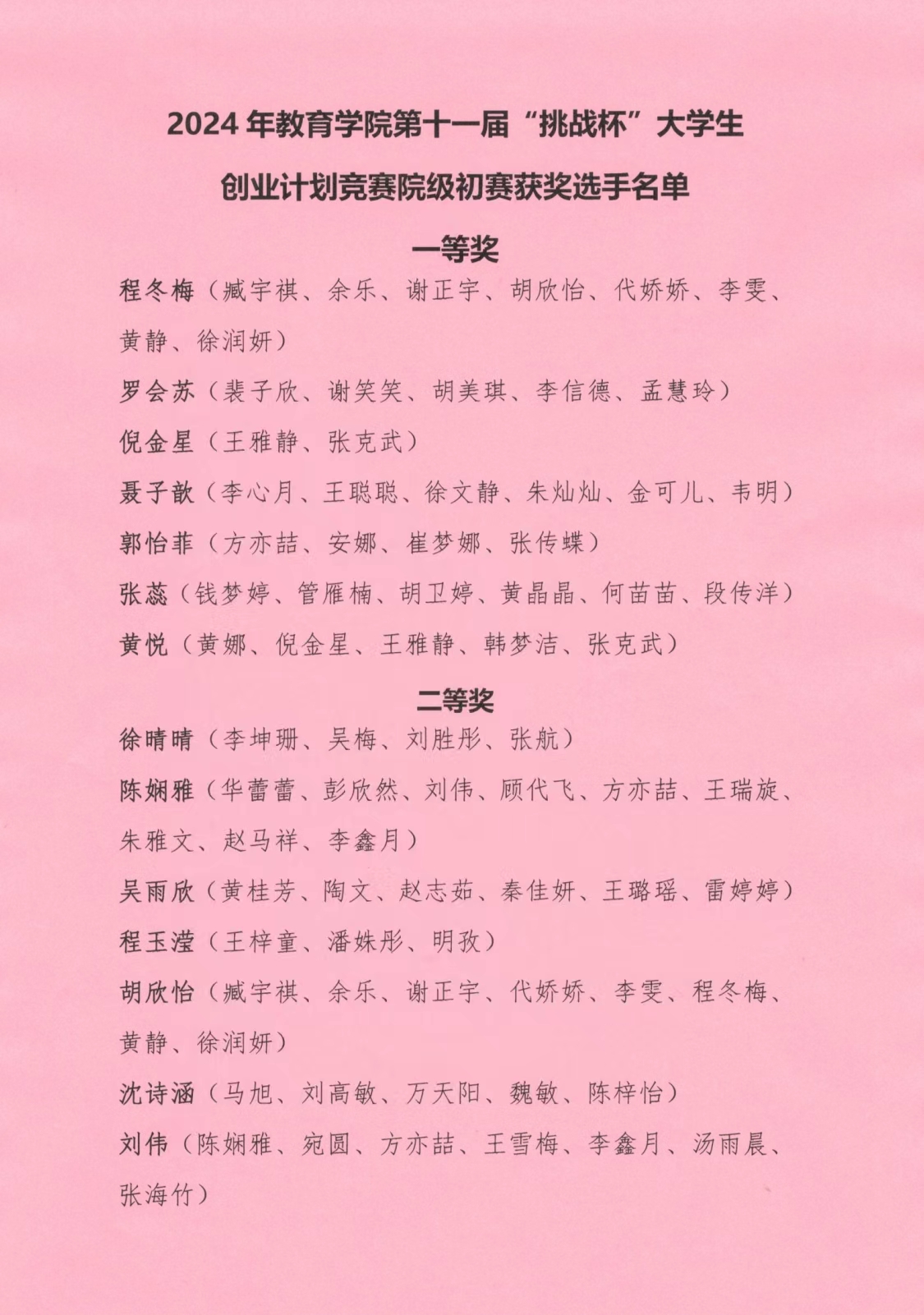 2024年LETOU国际米兰官网第十一届“挑战杯”大学生创业计划竞赛院级初赛获奖选手名单