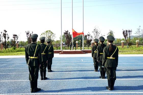 迎着朝阳,国旗护卫队踏着坚定的步伐,庄严入场。伴随着激昂的《义勇军进行曲》,鲜艳的五星红旗冉冉升起、随风飘扬,在场师生怀着对祖国无限的热爱,向着国旗行注目礼。