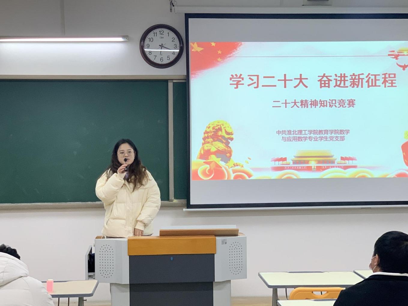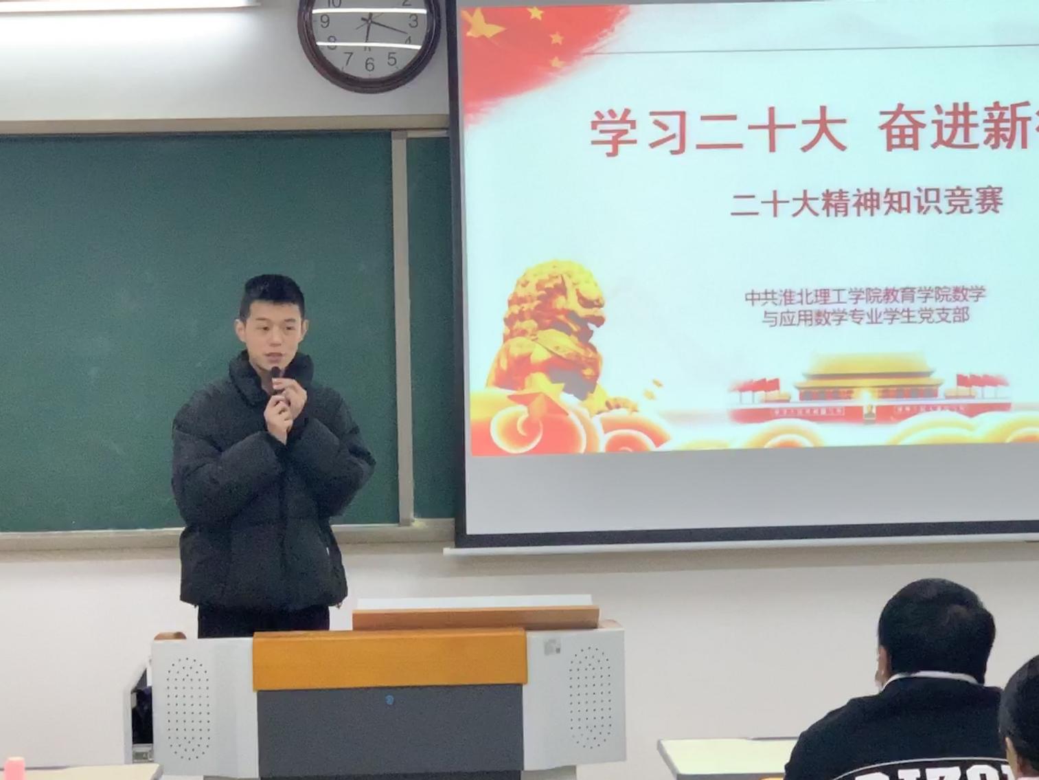 为深入学习宣传贯彻党的二十大精神,回顾党的光辉历史,推动党的二十大精神落地生根、入脑入心。LETOU国际米兰官网数学与应用数学学生党支部积极部署,于12月1日在1教313开展“学习党的二十大精神知识竞赛活动”,活动由支部委员孙虎主持,支部书记陈媛媛、全体支部党员及入党积极分子参加了活动。