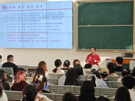 会上,黄莹莹老师对暑期留校学生的学习、生活及日常管理工作做了周密的布置,详细介绍了学校及学院在暑期提供的食宿安排、出行便利等后勤服务保障措施,她要求全体留校学生严格遵守考勤要求,保持通讯畅通,配合学院动态管理,共同维护安全稳定的留校环境。
