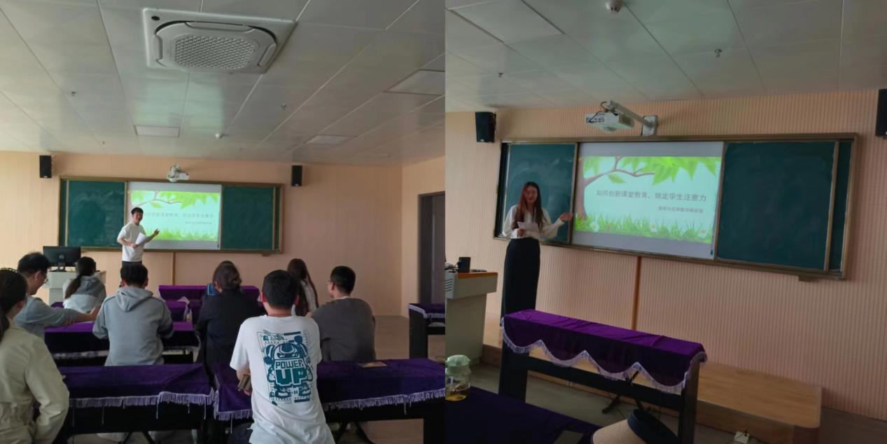 首先,檀雷雷老师表明教师说话应该幽默风趣,富有节奏感。在课堂上应尽量用赞赏的眼光表扬学生,用鼓励的眼神安慰学生,用自信的神情激励学生积极思考,不畏困难,从而使学生的注意力更长久。随后,刘林老师谈到课堂教学内容需要合理编排。在教学中,教师应该有意地促使学生注意重点、难点的内容,在教学过程中穿插一些生动有趣的例子,这样不仅增加了内容的趣味性,又不会使学生过度疲劳,更好地提高教学效果。