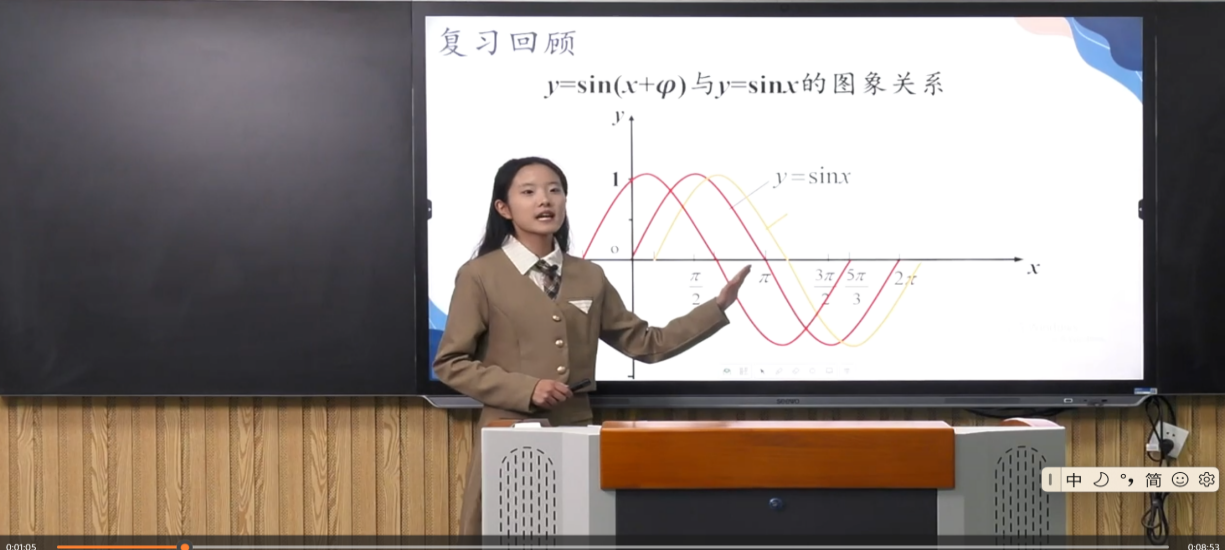 国赛中,朱灿灿同学讲授了高中数学人教新课标A版必修第一册第五章第六节《函数y=sin(ωx+φ)》,在讲到正弦型函数图形特点时,巧妙地引入课程思政点,即人生轨迹正如正弦型函数的图象,有波峰和波谷,起起伏伏,人的一生会遇到很多的麻烦、困难、挫折,不要害怕眼前的失败,而是要学会努力调整和适应,在忙忙碌碌中收获充实的人生,充分展现了当代师范生的良好精神风貌和未来的教师风采。