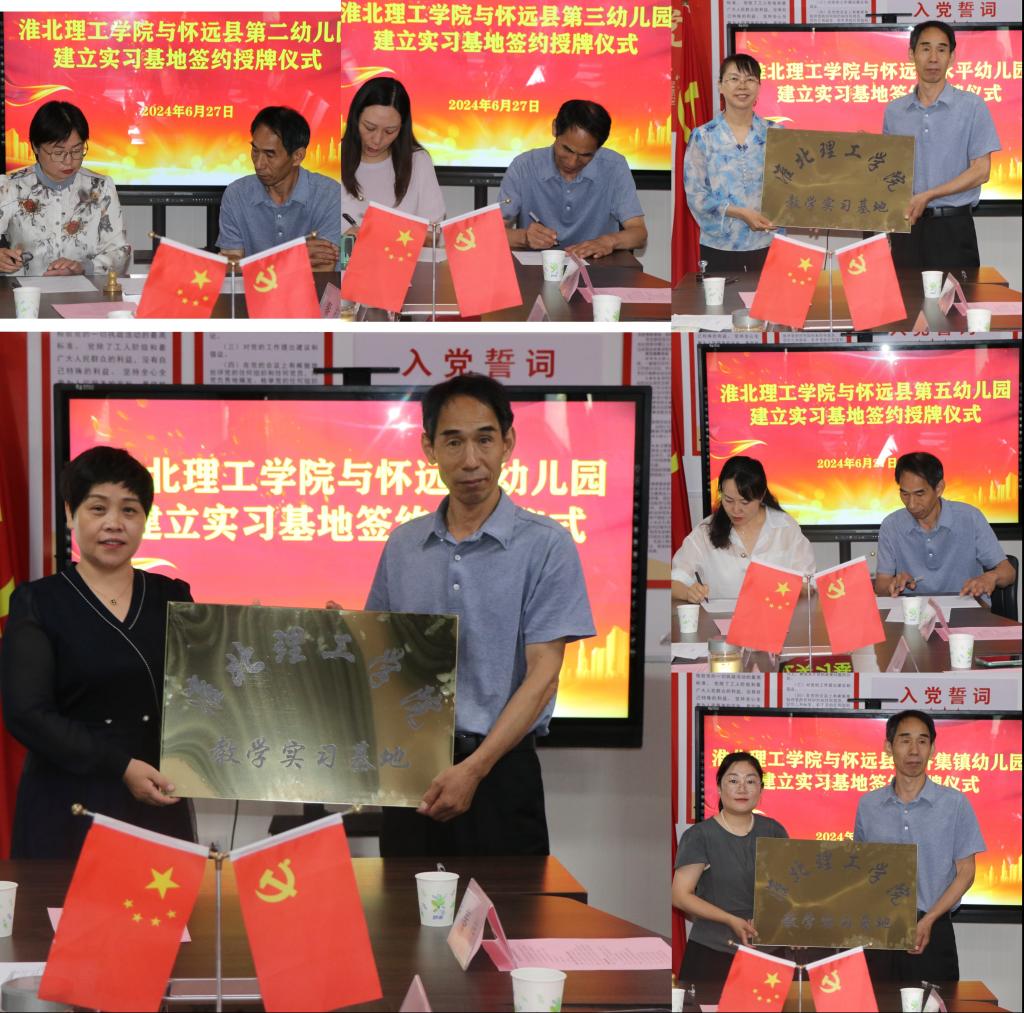 在实践基地的六所幼儿园园长分别对各自园所进行了详细介绍后,怀远县县幼园长刘利代表宣读实践基地签约协议书,双方就协议书的内容进行了充分的交流和沟通。而后在友好而庄重的气氛中,LETOU国际米兰官网LETOU国际米兰官网副院长谢贤德与六所园所园长分别签订协议书,并举行了授牌仪式,这标志着双方合作迈出了坚实的一步。