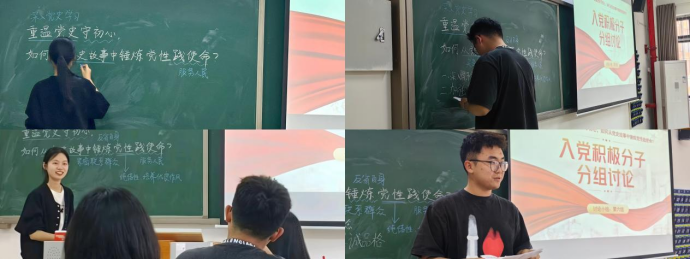研讨以小组为单位开展。各小组分别以“如何发挥党员先锋模范作用”、“重温党史守初心,如何从党史故事中锤炼党性践使命”、“习近平新时代中国特色社会主义思想及党的二十大精神”为题进行交流研讨。大家分别从“青年学生应该如何担当作为”、“学习新党章”等方面谈自己的学习感悟,大家表示要以党员标准严格要求自己,在班级学习、生活等方面积极带头,以实际行动积极向党组织靠拢。