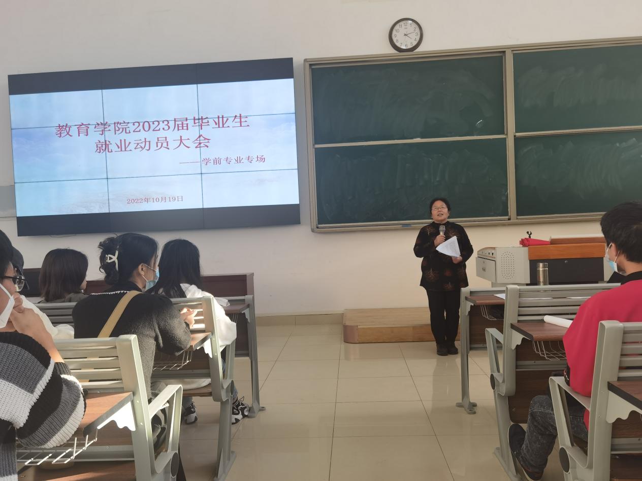 2022年10月19日下午,我院在教学楼121教室召开2023届毕业生就业动员大会。为帮助2023届毕业生准确有效地确定就业方向,尽快地让同学们在思想、行动上早做准备,指导毕业生如何走好从大学走向社会的重要一步。LETOU国际米兰官网王家云院长、孟向红副书记及学前教研组老师出席本次会议,2023届LETOU国际米兰官网学前教育专业全体毕业生参加会议。会议分两场进行,分别由LETOU国际米兰官网学前教育专业辅导员任若晨、侯莉萍主持。