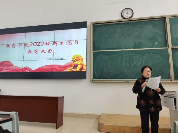 会议伊始,全体党员起立,奏唱国歌。孟向红代表学院对2022级学生党员进行教育讲话。她指出,在全党上下隆重庆祝党的二十大胜利召开之际,举办此次大会有着非常特殊的意义,在座的78名党员同学是学院青年学生中的杰出代表,“党员”不光是优秀的代名词,更代表一种责任、一种义务。只有“平常时候看得出来,关键时刻站得出来,危急关头豁得出来”,才是党员应有的样子,她希望大家坚定不移听党话、跟党走,怀抱梦想又脚踏实地,在学习生活中带头遵纪守法、刻苦学习、服务师生、立志成才、服务社会,在实干中增长才干,配合好辅导员老师做好班级、学院的各项工作,为学院的学风建设、人才培养、学生管理等方面做出自己的努力。孟向红还带领全体党员共同学习了《争做有理想,有担当,能吃苦,肯奋斗的新时代青年》,激励青年学生树立远大理想,勇当先锋、勇挑重担,学习革命前辈能吃苦、肯奋斗的精神,不忘入党初心,在学习、实践中彰显榜样作用,践行党的先进性。