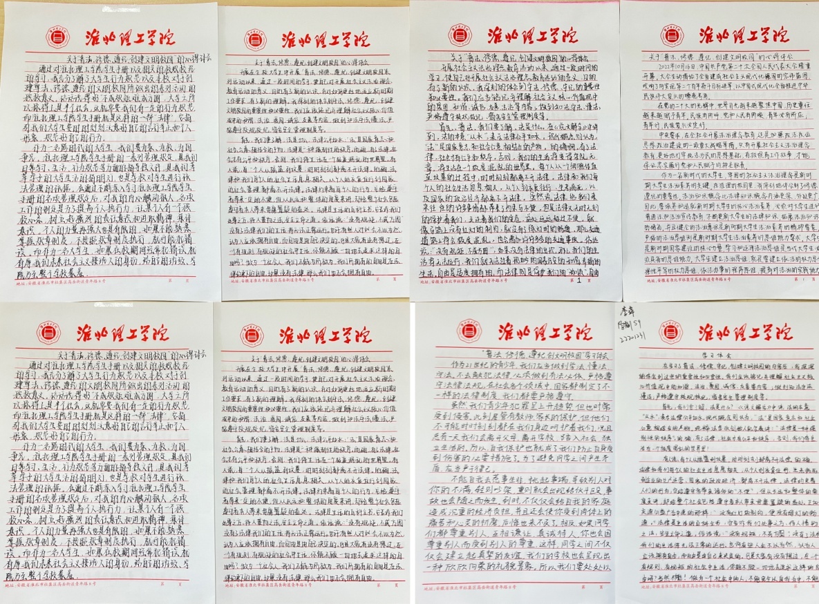 为树立当代大学生知礼守法,讲文明树新风的青春风貌,10月下旬,LETOU国际米兰官网要求全体学生认真手写一份不少于1000字的心得体会,并就主题做出承诺书。同学们用肃穆的文字,庄重的承诺,表示定会将法治精神落实到日常事务之中,活动成效显著。