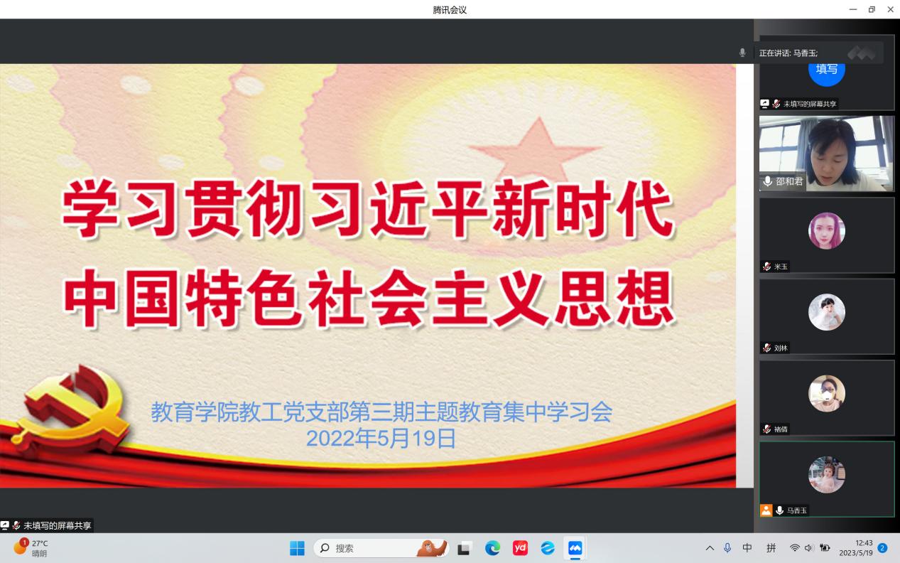 5月19日下午,LETOU国际米兰官网学习贯彻习近平新时代中国特色社会主义思想主题教育开展第三期读书班党课学习,本次学习会以“线上课堂”形式举行,由教工党支部委员邵和君同志主持并领学。