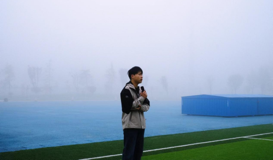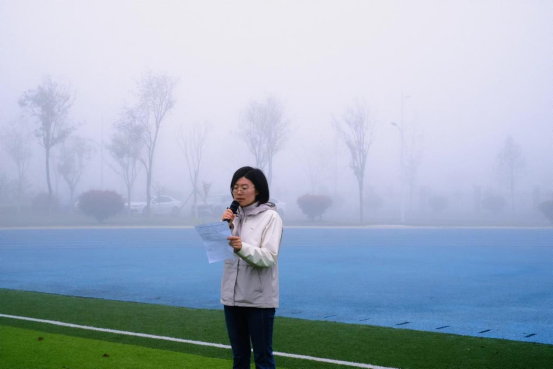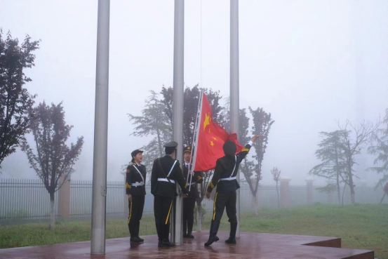升旗仪式正式开始,国旗护卫队迈着铿锵有力的步伐庄严入场,五星红旗在晨曦中冉冉升起;全体师生整齐肃立,目光如炬,高唱国歌,向祖国表达崇高敬意。